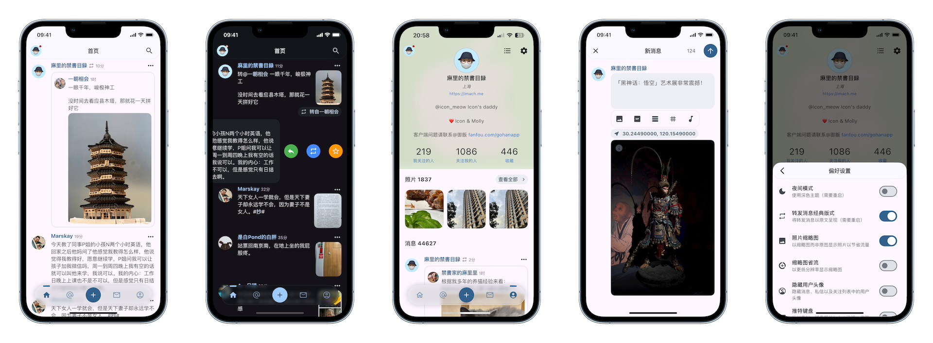- 偏好设置:自动刷新,主题定制,转发消息排版,照片大小,头像显示,一切由你定义。